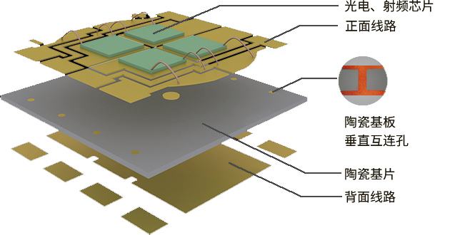 薄膜電路陶瓷封裝基板是一種通過磁控濺射薄膜金屬化與電鍍制程的技術:即根據應用需要,在高導熱的陶瓷基體上,采用薄膜金屬化及影像轉移方式制作2D金屬線路,然后采用TCV(Through Ceramic Via) 技術形成雙面布線間的垂直互連,最后采用堆疊技術獲得與陶瓷基體結合緊密的一體式3D金屬框架?;诒∧る娐饭に?,通過磁控濺射實現陶瓷表面金屬化,通過電鍍實現銅層和金成的厚度大于10微米以上即DPC(DirectPlateCopper-直接鍍銅基板)。